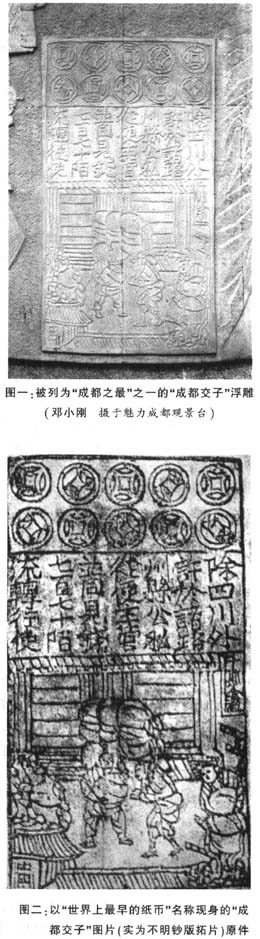 在南出成都的府河与沙河交汇处,有一处被称做“魅力成都观景台”(原处叫“凤凰台”)的景致。那里矗立着一座题为“成都之最”的青石浮雕柱,镌刻着一直令成都人引以自豪的历史上的六人“成都之最”。只是在“成都交子”名下的一幅浮雕(图一),却显系误植;因为那不过是一件传自日本的“身份”不明的钞版拓片,其内容和格式,与我国史籍所载北宋交子或其他纸币的实际情形大相径庭。类似的问题还出现在《成都历史(乡土教材)》、《巴蜀百年》,“等近几年出版的本土图书中。(图二)不过,这样的错误,即连境外的一些知名学者也未能幸免,如李约瑟编著的《中国科学技术史》、钱存训撰写的《中国纸和印刷文化史》。