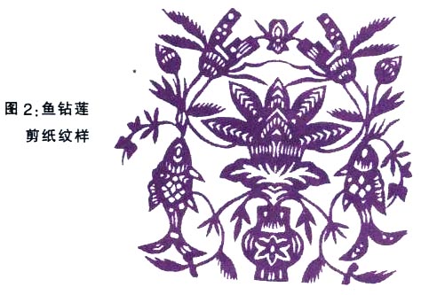 中国的生殖崇拜不同于印度那种赤裸裸歌颂男女性爱的表达方式,大多是通过象征、暗喻的表现手法呈现出来。因此莲花作为象征生殖崇拜、男女情爱的隐喻纹饰,在民间广为流行,尤其多见于婚嫁的居室装饰、器具装饰、服饰用品等。必须指出的是,莲作为女阴、女性的象征意义,在表现繁衍生息的祥瑞图案中只是其中一部分,人们通常用鱼、鸟、子等形象素材与其组合成各种纹样来表达完整的意义。最为世人所熟知的莫过于“鱼戏莲”(图2)、“鸳鸯穿莲”、“蛙闹莲”等等吉祥图案。值得一提的是,在陕北的民间剪纸造型艺术中,“鱼戏莲”图案细分为两种——“鱼戏莲”和“鱼钻莲”(或“鱼唆莲”)。二者在造型上的区别是前者鱼在莲叶上或水面上,意为恋爱;后者则是鱼在莲叶下去咬莲茎,意为结婚(实暗喻性交)。闻一多先生曾对“鱼戏莲”作过一个著名的解释:“用鱼喻男,莲喻女,说鱼与莲戏,实等于说男与女戏。”在陕北民谚中有“鱼儿戏莲花,夫妻两个没麻瘩”,“鱼儿闹莲花,两口子上炕结缘法”的说法,因此“鱼钻莲”的莲花上可以剪一个娃娃造型,称“娃开莲”,意为可接二连三地生孩子,“鱼戏莲”则不可。