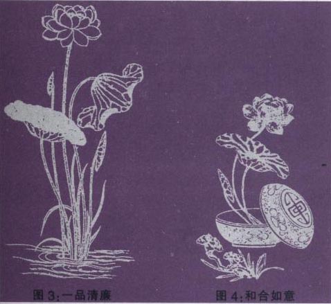 “实用功利”这一传统思想特征在莲纹的发展中也有很生动的反映。同样是莲和鱼的组合,“连年有余”纹样的文化涵义显然有别于“鱼戏莲”。莲的生殖崇拜的文化意义在此得以分化,从人的原始生殖繁衍推广至物产丰收和对生活富裕的美好向往。中国传统的实用功利思想的浸染使民间发展出大量以莲为题材的吉祥纹样,手法多利用“莲”、“荷”的谐音作彩头,如“莲”谐音“连”、“廉”,寓意持续、久远、纯洁、清白,纹样有“连年如意”、“百子连科”、“连生九子”、“一品清廉”(见图3)等;而“荷”与“和”、“合”同音,则寓意和睦、合作、团结,纹样有“百年好合”、“和合如意”(见图4)、“一团和气”、“和舟共济”等。