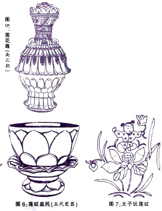 通过上述对传统莲纹的文化意义的历史寻绎,我们可以发现今人对莲的理解其实已呈萎缩状态。莲,其实并非只是“出淤泥而不染”的单薄形象。周敦颐的“君子莲”实际是利用了佛教莲文化,以儒家文化为遗传母体,在宋明理学的篱笆内培养而成的变体。而莲的这种高洁形象多出现在文人画中,民间的装饰莲纹却多是以生殖崇拜、实用功利、佛教影响为表现形式的。中国的传统纹样可谓浩如烟海,它们原本皆有丰富的寓意,但随着历史车轮无情地向前驶去,国人已渐不识其旧日容颜。本文仅对莲纹的文化意义作了粗浅的探索,竟已发现它的背后潜藏着中华民族的传统精神理念、审美观念、价值尺度、道德标准的深意。呜呼,继承与发展民族传统文化任重而道远!