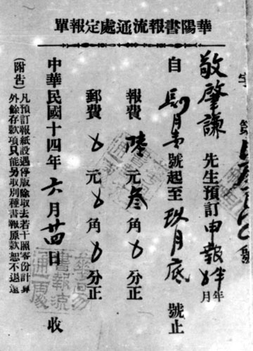 四川省博物馆收藏有华阳书报流通处的一张“华阳书报流通处定报单”(如图)。该定报单用毛边纸制作而成,上用黑色油墨铅印,字为仿宋体.其纵22厘米,横13厘米,“华阳书报流通处定报单”十字,从右至左横排。订报单上盖有“华阳书报流通处”印二枚。印正方形,边长各3厘米,楷书朱文。这张定报单使用于1925年,1981年被发现。当时该定报单夹在四川省博物馆馆藏的文物《新青年》内,原件保存完好。这种定报单想必当年曾印制不少,但能保存下来实属不易。据推测,大概是当年的读者(或订报者)信手将它夹在书中,几十年未有人翻阅过,才得以幸存下来。这是华阳书报流通处的惟一遗留物,对研究成都地区新文化史、革命史具有重要价值。