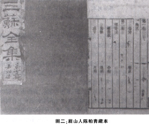 眉山人陈柏青藏本(图二),书高26厘米,书广18厘米,深蓝色封面,内页正文为白色棉纸,纸质细白,雕刻工整,墨色均匀,是所有藏本中品相最好的。