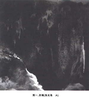 大胆的泼墨泼彩和严谨的构图是张光海山水画的一大特色。他以咫尺画幅抒发胸中情愫,时而酣畅淋漓,时而隽永静穆,众多的山水画和花鸟画《涅槃》等作品一样,充分表达了画家的人文精神。如其《大地母亲系列组画》以及《祈祷》(图一)、《生存的呼唤》等作品,都在倾诉画家对生态危机的深刻忧虑,都在呼吁人类要关爱自然,珍惜生命。其山水画的构图,一反传统水墨写意山水画边角常留空白的手法,巧妙地利用、吸收古今中外人类共同的成功视角经验,力求寻找情感与理性间的平衡。在他的山水画中除了传统笔墨韵致,还包含着若有若无、若隐若现的其他艺术,如水彩画、水粉画、装饰画乃至抽象艺术的元素。与西画的三维塑造不同,画家完全是在二维空间的平面中展示自己的彩色梦幻。但墨块色块的分割、隔离、掩映、浓淡的交织,使画面呈现出多重的空间层次,生成平面的张力,纵深的张力,从而产生一种叠幻的视觉牵引力。画面欣赏起来如层层剥笋,分外耐看耐品。如果没有他二十多年的美工生涯,遍历名山大川的经历和多方面的艺术修养,非凡的胆识和强烈鲜明的个性,是很难把握这些丰富的想象力以收拾成章的。