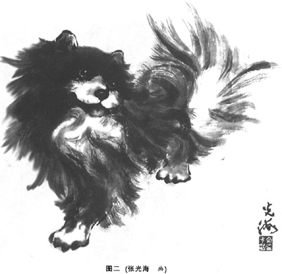 张光海擅长描绘一些性情温顺的小型动物,如猫、狗、松鼠、熊猫等。(图二)由于平日细致入微的观察和不断的写生,他笔下的小动物个个造型准确,都符合西画的骨骼、透视等法则,同时又生动、乖巧而惹人喜爱。其技法特点主要表现在虚实处理的精当娴熟。在造型的虚实上,多是细腻地刻画动物的眼睛和头部,勾勒身体则寥寥几笔。在用笔和墨色运用的各个环节,也都把虚实处理得十分巧妙得当,因而画面显示出浓厚的传统水墨画的内涵和韵味。