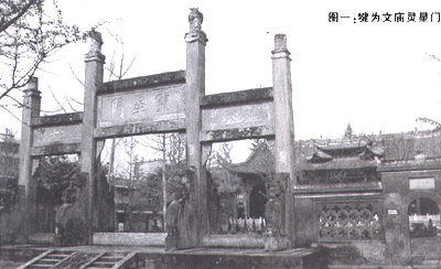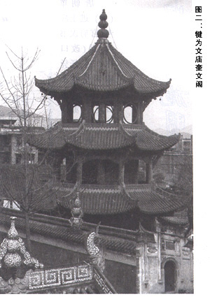 “奎”为二十八宿之一,有星16颗,屈曲相钩,有如文字,《孝经》称奎星主文章,演化为文官之首,于是文庙便有了奎文阁(图二)。奎文阁共三层,为六角形建筑,高约12米,每层均覆盖绿色琉璃瓦,飞檐凌空,颇为壮丽。其始建于清代乾隆年间。据县志记载,建奎文阁前。犍为在20年间乡试无一人中举;而奎文阁建成后,当年便中四个举人,第二年又出了进士。从旧时风水学观点来看,建奎文阁可使文运昌盛;不过以今人观点来看,其不过是机遇巧合罢了。