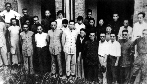 阳翰笙生于1902年,比郭沫若小10岁,宜宾高县人。他对郭沫若虽说心仪已久,但真正相识,还在1926年到广州以后。1925年“五卅”前后,阳翰笙(1925年加入中国共产党)在上海大学边读书边从事工运,并任上海学联总会执委,后出席全国七届学代会。郭沫若此时也在上海,与曾琦、熊晓岩、何鲁等筹组四川旅沪学界同志会,并起草《五卅宣言》发在同年7月《晨报副刊》上。两人虽在同一个城市,为了同一目的斗争,却无缘见面。1926年1月阳翰笙奉调广州。5月初,他在毛泽东主持的农民运动讲习所里,听到郭沫若的讲演。两个川南老乡一见如故。会后,郭与川人陈启修发起组织四川革命同志会,邀请阳翰笙参加。5月14日,四川革命同志会在中山大学举行成立大会,郭与陈当选为执行委员。郭兼出版部委员长,负责起草宣言、筹办会刊,阳被选为监察委员。从此开始了他们长达几十年的合作共事。其时北伐军兴,郭沫若毅然投笔从戎,邀约阳翰笙、李一氓一起从军。在周恩来的安排下,阳翰笙暂留下,郭沫若、李一氓随军北伐。1927年7月2日,在广东大学法科院,四川革命同志会为郭沫若举行隆重欢送会。阳翰笙在会上代表“同志会”致欢送辞,豪情洋溢,大壮行色。郭沫若听后,异常激动,表示要“从宣传民众、组织民众中夺回政权来”!