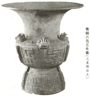 最值得一提的是青铜制品六鸟三牛尊和三鸟三羊尊。六鸟三牛尊共两件,口径分别为49厘米、47厘米,通高分别为56.5厘米、52.6厘米;在肩折处立雕有三个突出的牛头,牛头上和相邻两头牛之间各铸一鸟,作浮游状。其牛角向上微弯,似现在水牛的图像,鸟站在牛头上。牛眼用云雷纹代。整个造型不求形似,而求神似,透溢出一种威严的气氛。三鸟三羊尊亦两件,口径分别为42.6厘米、40.4厘米,通高分别为 45.5厘米、41.6厘米;肩上立雕有三个羊头和三只鸟。羊头的眼雕为小眼,长有向后盘曲的一双大角。整个形象和现在的绵羊极为相似。它们都是用以盛酒的,但如此造型,在中原地区的商周出土青铜酒器中极少见;然而却与湖南华容(长江中游)及陕西城固(汉江上游,属长江水系)出土的青铜尊的风格颇为接近。