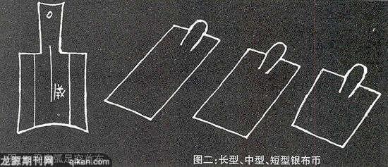 褚斌杰《诗经全注》注为:“布,币。上古以布为货币。《周礼·地官》郑众注:‘布,叁印书,广二寸,长二尺以为币,贸易物云。’故布,以布为质料,有书印,按一定尺寸制作的货币。贸:贸易,购买。” 〔6〕褚氏将“布”注为币,将“贸”注为购买,是一个大进步,值得肯定;但把“布”说成是布料做的“币”,应属不当。《盐铁论·错币篇》说:“古者市朝而无刀币,各以其所有易无,抱布贸丝而已。”这个说法是错误的。殷商时代已经使用贝币,西周开始已使用金属铸币。唐石父主编《中国古钱币》说:“殷墟5号墓(妇好墓)随葬六千余枚海贝……(贝)已有了货币的职能。”又说:“布币是由农业生产工具——铲演变而来,并认为‘布’是‘镈’的假借字。依形制可分为空首布与平首布两类……1970年在河南伊川富留店村,出土大型平肩弧足空首布604枚,通长90~101,足宽49~55厘米,重30克左右。” 〔7〕布币出现以后,刀币也出现了。(伊川出土的平肩弧足空首布,见图一)战国时期仍在使用布币。高至喜《楚文物图典》载:“长型银布币……1974年河南省扶沟古城窖藏出土。通长15.8,宽5.8厘米,重188.1克。币似铲形,实首,方肩,平足……应为楚系布币。这是目前所知最早的银质货币……中型银布币……通长14,宽6.1厘米,重210.2克,短型银布币……通长11.1,宽5.7厘米,重134.3克。” 〔8〕(上述长型、中型、短型银布币,见图二)