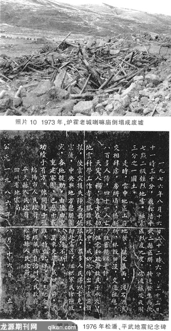 震害记述:1976年8月16日22时06分46秒,松潘、平武间发生7.2级地震,震中烈度Ⅷ度。Ⅷ度区在松潘龙滴水药场、双河、小河及平武黄羊一带,面积600余平方公里。区内穿斗房普遍梭瓦,砖木房多数破坏,毛石墙倒塌;双河、龙潭、小河、丰岩堡、黄羊、草原、虎牙关一带沿涪江两岸出现严重山崩、垮崖、滑坡,造成交通、通讯中断,道路、农田、村庄被毁;小河乡陈家村白崖山崩,堵塞河道,形成2000米长,120米宽,30多米深的地震湖,淹没村舍;小河城南及白崖、黄水沟一带发生泥石流,湮没村庄、农田,河道阻塞,积水成湖;海拔3667米的元宝山发生严重崩塌、剥落。Ⅶ度区在平武牧羊场、战斗、白马、水晶、虎牙关和松潘白杨坝、观音岩一带,面积1300余平方公里。区内一般穿斗房损坏,老旧房破坏。陕西宁强、勉县有房屋倒塌,青川、旺苍、广元以及甘肃康县、文县也有破坏。四川大部分地区和内蒙呼和浩特、宁夏、北京、山西临汾、湖南长沙、云南昆明、甘肃兰州和高台、贵州习水等也有震感。