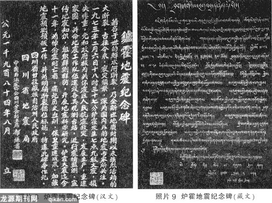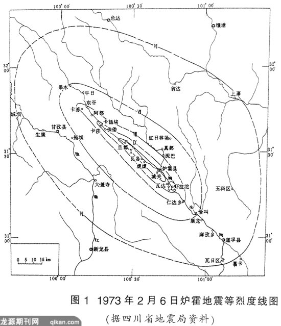 震害记述:1973年2月6日18时37分7秒,炉霍雅德发生7.6(原作7.9)级地震。极震区(Ⅹ度)在炉霍城、虚虚、旦都一带。极震区长41公里,宽4.5公里,面积约150平方公里。区内藏民房屋全部倒平(见照片8~10),“笨壳”房和穿斗房严重破坏或倾斜,地裂、滑坡、塌方严重;雄鸡岭红旗桥严重破坏,另有9座桥梁产生不同程度裂缝,或栏杆倾倒;25座涵洞受到损坏。Ⅸ度区在炉霍忠仁达至侏倭一带,长68公里,宽11公里,面积约530平方公里。区内Ⅰ类房屋几乎全部倒塌,木架房大部分倒塌,其余严重破坏,有滑坡、塌方及“山剥皮”现象。Ⅷ度区在炉霍仁达至甘孜东谷一带,长86公里,宽19公里,面积约1300平方公里。区内河岸和陡坡地方有塌方现象,约40%藏民房屋倒塌或严重破坏。Ⅶ度区在道孚孔色至甘孜果木一带,长约120公里,宽约47公里,面积约4390平方公里。区内普遍出现房墙裂缝,檐瓦掉落,屋脊下滑等现象,少数老旧藏民房屋倒塌。Ⅵ度区在道孚葛卡至甘孜绒坝岔一带,长约195公里,宽约120公里,面积约13200平方公里(见图1)。区内Ⅰ、Ⅱ类房屋大部分损坏,少数破坏,质量较好的房屋完好或仅有轻微损坏;道孚城东林业局和兵站房屋墙体开裂,阳台倒塌;麻孜忠烈桥护坡开裂,下沉5厘米。