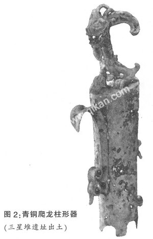 三星堆一号坑出土的青铜爬龙柱形器(图2)上的龙,生有两对四支向下卷曲的犄角(一对大、一对小)。按其形制,这当是青藏—川西高原毛用羊——绵羊的盘羊角(二号坑出土的三羊三鸟尊以及铜罍上的羊角,也是这种盘羊角)。