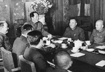 2.第一次遇险。司令部前移是彭总一贯的风格。彭总是进入朝鲜战场的中国人民志愿军的第一人。1950年10月19日傍晚,夜已经黑下来了。在第一批志愿军过鸭绿江之前1小时,司令员彭德怀仅率4人,一辆吉普车,一辆电台车,最先进入战火纷飞的朝鲜,他着急了解战场情况啊!秘书杨凤安说:“只身入朝,太危险了。”彭德怀说:“后面是我的几十万大军。”21日上午,到达大洞与金日成会谈,当时金没有带电台,而途中电台车还掉了队,彭总也丢了电台。这时天上大批敌机呼啸而过,四周炮声隆隆,前后左右都是敌人,只是敌人不知道对方的两个统帅都在这里。