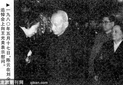 1979年2月,中共中央正式决定复查刘少奇一案。复查工作由陈云主持的中央纪律检查委员会和胡耀邦主持的中央组织部共同负责。4月18日,刘少奇专案复查组正式成立。要为刘少奇平反昭雪,并不是一件简单的事,因为刘少奇的案件是经过了党的八届十二中全会讨论通过的,不是哪一个人说了就算数的。但陈云总感觉到为刘少奇的冤案平反,是一个分清历史是非的大问题。在陈云的指导下,专案复查组从给刘少奇戴的“叛徒、内奸、工贼”这三顶大帽着手,到武汉、长沙、南京、上海、天津、东三省等地广泛开展调查工作,复查组本着陈云等中纪委领导对复查工作的要求,以客观公正的态度看材料,认真细致地翻阅了所有原专案组的所谓揭发检举定案材料,看过的定案案卷有430多卷,相关的案卷570多卷,调查了所有的证人和相关的人,查找翻阅了当年的有关报刊和敌伪档案。不论职位高低,只要是复查需要,都作面对面的调查。经过10个月的日夜奋战,复查组用确凿的调查证明材料,写出了刘少奇专案复查报告,报告以充分的事实说明,把刘少奇打成“叛徒、内奸、工贼”的罪名,是虚构、捏造和诬陷的,“三顶帽子”根本不成立。这个复查报告,经过中央政治局的讨论和修改,就形成了1980年2月29日的《中共十一届五中全会关于为刘少奇同志平反的决议》。1980年5月17日,刘少奇追悼大会在北京人民大会堂隆重举行,党和国家领导人及首都各方面代表1万多人出席追悼大会。邓小平在悼词中高度评价了刘少奇的一生,他说:刘少奇同志是受到党和全国各族人民爱戴的、久经考验的、卓越的党和国家领导人。追悼会的前一天,陈云专程从杭州赶了回来,在追悼会上,他紧紧握住王光美及刘少奇家人的手,没有说话,他的眼睛湿润了。