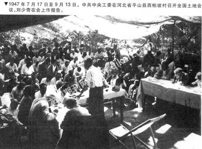 1947年7月17日至9月13日,刘少奇受党中央的委托,在河北省平山县西柏坡村主持召开了全国土地会议,制定了《土地法大纲》,提出没收地主土地和征收富农多余土地分给农民,它规定在向地主和一部分带封建性的富农进行斗争的时候,必须把地主与富农、中小地主与大地主、政治上进步的与反动的地主、富农区别开来,争取地富家庭出身的知识分子,保护工商业,不侵犯中农,要善于向中农让步等正确的政策。中共中央完全同意《土地法大纲》并予以公布。