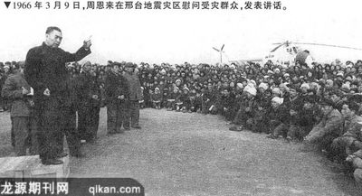 就在周恩来召开北方农业小组会议期间,3月8日凌晨,河北省邢台地区发生强烈地震。当即,周恩来便要他的秘书安排直升飞机,前往邢台视察灾情。同时他又指示卫生部和解放军总参谋部,立即派出医疗队前往救护。当天夜晚,他召集国务院和总参谋部有关人员开会,商定紧急措施:(一)由国家科委和科学院为主,集合地质部等有关地质勘察和物探技术力量前往地震现场进行探测、观察和研究,以便进一步判明地震范围、性质和方向,并将有关资料带回北京进行科学探讨。(二)由曾山(时任内务部长)代表中共中央、国务院前往视察慰问,进行救护安排。(三)由卫生、公安、内务、供销社、兽医、铁道、农业等部门组织医疗、供应、工程人员随队前往,协助当地进行救护工作。(四)周拟于明(九)日下午飞石家庄,视察这次地震灾情。