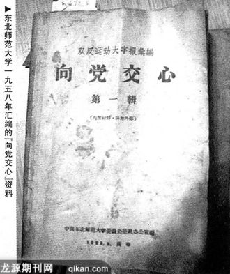 1958年,反右派运动余波未断,旋即展开了“双反”(反浪费、反保守)运动,长春各高等院校民主党派和无党派民主人士“向党交心”的运动,并以大字报的形式对外张贴、展览。东北师范大学委员会整风办公室还特别编辑了《向党交心——双反运动大字报汇编》,按照当时的说法,是“积累社会主义教育的思想资料,研究资产阶级知识分子的政治思想状况,和他们在交心运动中的动向,以便更好地进行思想政治教育工作”。