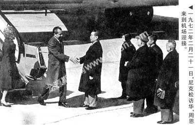 1972年2月21日上午11时30分,尼克松乘坐的专机抵达北京首都机场,周恩来等亲临迎接。尼克松自舷梯走下,周恩来迎上前去,两人热烈握手,周恩来寓意深刻地说:“你的手伸过世界最辽阔的海洋来和我握手。”后来,尼克松也在文章中写道:“当我们的手相握时,一个时代结束了,另一个时代开始了。”