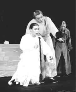 刘:是的,我是去年刚从“中戏”(中央戏剧学院的简称,下同)戏文系编导班毕业的,这个剧首排时的导演,是我的同班同学郭琪。演雍正的丁霄汉,演狗儿的何涛,都是三四年前从“中戏”表演大专班毕业的。其余的人员,也基本都是戏剧学院毕业或在校的学生。这个剧本,原本是我的毕业创作作业。去年,学校决定选四个学生毕业作进行实际排演,为这拨了十万块钱的经费,我们的老师、同学们就用这十万块钱,排了四台戏,其中就有《血色玄黄》。平均每台戏只有两万五千块钱可用,可是,光租一把龙椅做道具,一天就要几百块钱,所以很多事都只能将就,挺艰苦。《血色玄黄》排成后,上演了四场,算是汇报演出。然后,当然就是停了。