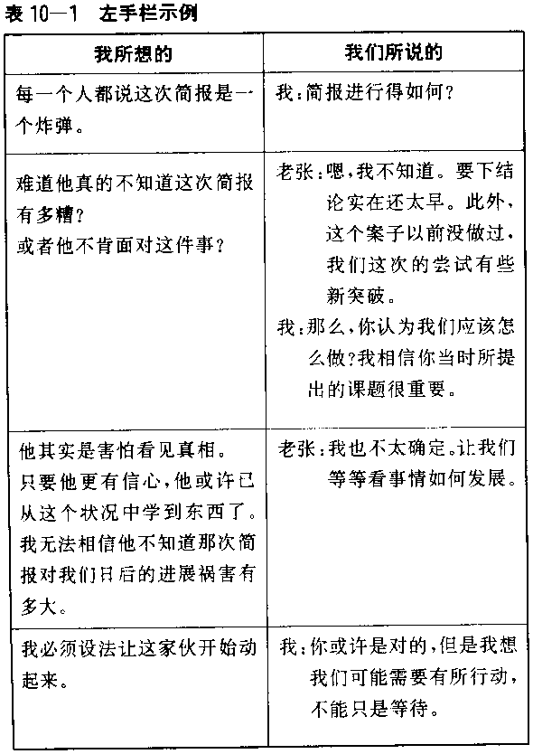 老张答:我也不太确定。让我们等等看事情如何发展。 我问:你或许是对的,但是我想我们可能需要有所行动,不能只是等待。 现在让我们把这段交谈用“左手栏”的方式呈现如表10—1所示。 练习“左手栏”经常可成功地将隐藏的假设摊出来,并显示这些假设如何影响行为。在上述的例子中。我对老张作了两项关键假设:第一,他缺乏信心,特别是当他正视自己不佳的表现时;第二,他不够主动。两项假设或许都不对,但是在我自己内心的对话中可以明显看出来,这两项假设都影响我对情况的处理方式。由于我认为他缺乏信心,害怕如果我直接说出来,他将丧失仅有的一点点信心,所以我未将真正想法说出。当我们谈论接下来做什么的时候,我认为老张缺乏主动精神的看法浮上心头。因为尽管我提出问题,他并没有说出明确的行动路线。我把这看作是他懒惰或缺乏主动精神的证据。由此种种,我归结:自己必须设法产生某种形式的压力,激励他有所行动,否则我只好亲自动手做这些事情。 看清我们自己的“左手栏”所得到最重要的教训,就是我们如何丧失在冲突状况中的学习机会。老张与我并未坦然面对问题,而是绕着主题的边缘说话。我们本应决定接下来该如何解决问题,结果却在没有明确行动方针的情形下结束交谈,甚至不曾认清这是一个属于需要行动的问题。 为什么我不直接告诉老张我认为有问题?为什么我没有说出我们必须检讨该采取哪些步骤,才能使我们的专案能够顺利进行?或许是因为我不确定要如何以有建设性的方式提出这些敏感的问题。就如同前面所提亨利的同事一般,我以为提出来会引发防卫性的、反效果的相互指责。我害怕情况会比现在还糟。也有可能,我避免提出这些问题,是出于礼貌或不想逼人太甚。无论原因如何,结果是我对这次的交谈并不满意,以致于想要诉诸更有效的方式来激励老张,使他有些积极的反应。 就像我跟老张的交谈那样,处理棘手的状况,并没有哪种模式一定是对的。但是先看清自己在未来可能使情况恶化的推论与行动,是有很大益处的。这便是“左手栏”的效用。一旦更清楚地看见自己的假设,以及我是如何被这些假设所障碍,我就可能使交谈进行得更有效益。无论是哪一种方法,基本上都要分享彼此的看法和它们所依据的原始资料。此外,有可能老张不认同我的看法和数据,也有可能我的看法和数据根本是不正确的(因为告诉我老张简报不佳的那位同事可能有所偏颇),我都需要随时保持一种开放的态度来面对。重要的是,我应该把情况转变成老张和我都能够从中学习。这需要我能够清楚诚恳地说明自己的看法,并了解沟通对象的看法,亦即一个阿吉瑞斯称为兼顾探询与辩护的过程。 二、兼顾的探询与辩护 大多数的管理者都被训练成善于提出与辩护自己的主张。在许多公司,所谓有才干的管理者,就是要能解决问题,想出需要采取什么行动,并获得完成工作所需要的支援。在企业组织中;往往重视辩才无碍、影响力或其他才能,探询的技巧却被忽略。当管理者晋升到高阶职位,他们遭遇的问题比个人经验所能涵盖者更复杂、更多样化,他们更需要深入了解别人的想法以及学习。管理者辩护的技巧有时反而会产生反效果——会把我们封闭起来,无法真正相互学习。我们所需要的,是综合运用辩护与探询,来增进合作性的学习。 但是两个善于为自己主张辩护的人,即使在一起开放、坦率地交换看法,也不一定会有什么学习的效果。他们或许真正开始对对方的看法感兴趣,但是仍抱持全然的辩护心态,这样所产生的交谈结果如下:“我欣赏我的真诚,但是我的经验与判断让我得到的结论不同。让我告诉你,为什么你的建议行不通”“———— 最初每一方都理性而心平气和地为自己的观点辩护,但只要辩护较为强烈一点,局面就会变得愈僵。缺乏彼此探询的辩护过程,只会产生更强烈的辩护。有一个对立情势逐渐升高的增强环路(如图10—1所示),可以描写接下来的发展,它跟前面图5—1所提军备竞赛的结构一样。