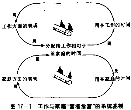 1990年《财星杂志》有一篇标题为“为什么评分得A的主管却是评分得F的父母”的封面故事;据观察,成功主管的子女比较可能发生情绪与健康问题。譬如密歇根大学的一项研究发现,在同一家公司,主管的子女每年有36%接受精神异常或滥用药物的治疗,非主管的子女只有15%。报告中又指出,主管长时间工作与个人特质(完美主义、没有耐心、讲求效率)是问题子女的元凶,并忠告精力充沛、对人我要求甚苛的管理者,需要学习如何不伤害子女的自尊与自信。然而,有趣的是,报告中并未提及为什么主管有效管理组织的方式,对于身为父母的角色毫无帮助?似乎该文作者也和我们大多数人一样,完全接受工作与家庭生活互相冲突是不可避免的事实,而人所处的工作环境和组织,对于改善工作与家庭的不均衡状态完全未扮演任何角色。 全面自我超越 近年来我注意到,在我们的领导与自我超越训练课程的学员之中,对工作与家庭课题的关切显著增加。“如何找到自己工作与家庭的平衡点”,现在也成为最多学员排在第一优先的课题。 无可否认的,传统的组织会促成工作与家庭之间的冲突。有些是由于个人为了成就事业,愿为工作而牺牲;有些则是由于工作上的需求与压力,无可避免地使家庭和工作的时间分配上发生冲突。这些工作上的需求包括出差、晚餐会议、早餐会报、周末外训,或甚至习惯性的长时间滞留在公司。那些压力则主要起于组织的眼光狭窄,将个人的目标完全排除在外:组织的目标就是一切,而不去衡量组织目标对个人或家庭造成的损失。 我相信学习型组织的各项修炼,将打破在企业中讨论兼顾工作与家庭这项主题的禁忌。如果学习型组织不能支持生活中每一个面向的自我超越,就无法支持真正的自我超越。如果不能唤起个人愿景,它就无法促成共同愿景。而个人愿景是多面向的,它包括对个人、专业、组织与家庭生活的深深渴望。工作与家庭之间的人为界线,从系统思考的观点来看是毫无道理的,一个人的工作与生活的其他面向之间,本来就是环环相扣的。 成功主管·问题家庭? 在工作与家庭不均衡的背后有一个系统基模。这个基模称为“富者愈富”(Success to the Successful),它包括两个增强环路(图17—l),分开来看,每一个环路都倾向于逐渐成长,但却争用同一个资源。在这基模的背后,个人、群体或组织不断地为一项有限的资源而竞争。成功的一方,因为其所在优势,倾向于得到更多的资源,而其他竞争者的资源则相对地减少。这些资源可能是多个事业部门竞相争取的有限投资金额;也可能是一间坐满学生的教室中,某位老师有限的赞美;或者是一位忙碌的管理者有限的时间。
