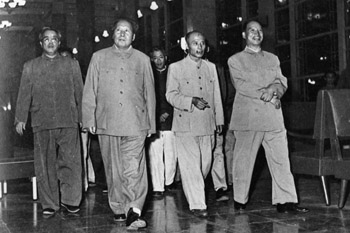 1959年9月15日零点10分到2点20分,毛泽东主席在北京市市长彭真,铁道部部长吕正操、副部长武竞天等的陪同下视察了新北京站。